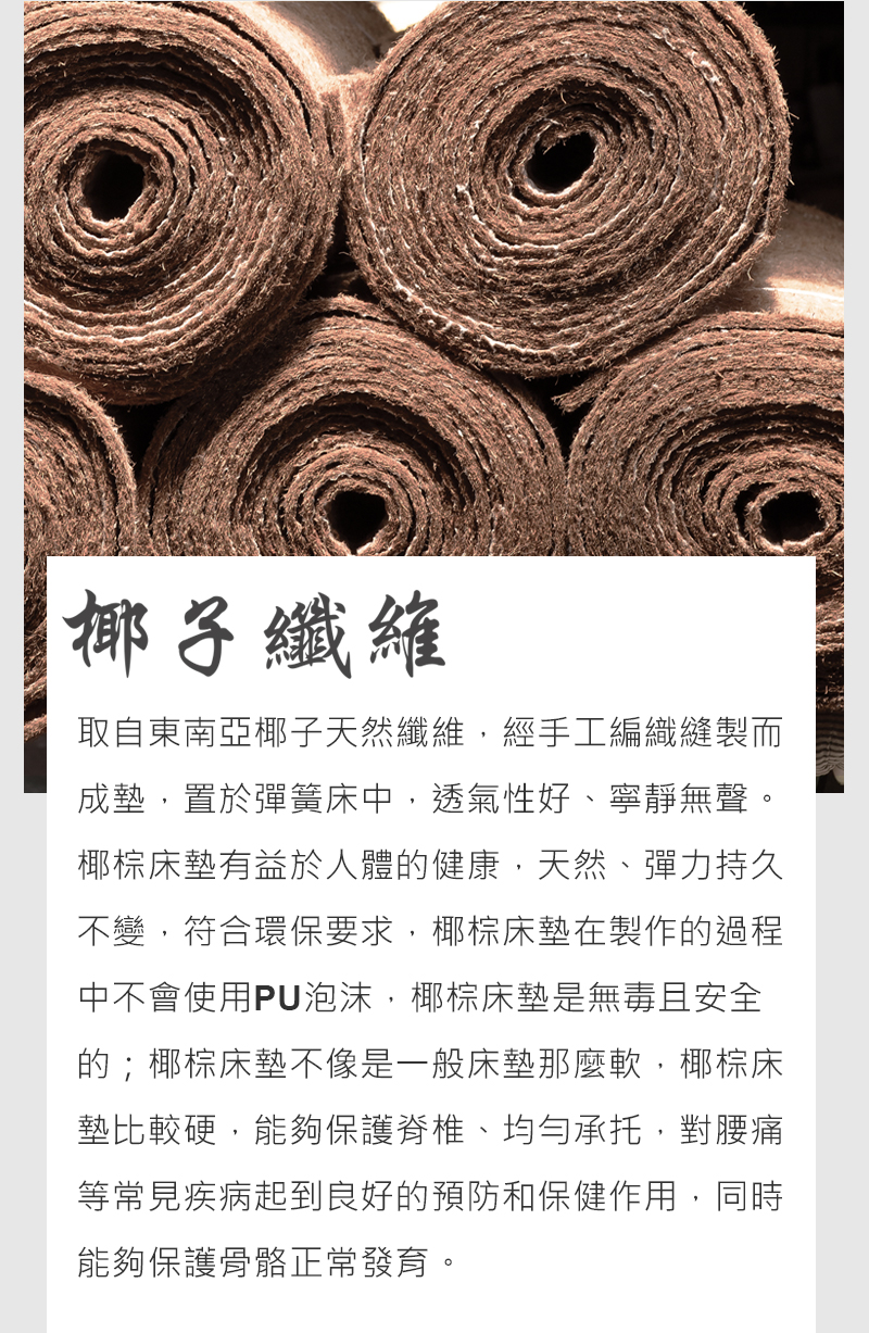椰子纖維 取自東南亞椰子天然纖維,經手工編織縫製而成墊,置於彈簧床中,透氣性好、寧靜無聲。 椰棕床墊有益於人體的健康,天然、彈力持久不變,符合環保要求,椰棕床墊在製作的過程中不會使用PU泡沫,椰棕床墊是無毒且安全的;椰棕床墊不像是一般床墊那麼軟,椰棕床墊比較硬,能夠保護脊椎、均勻承托,對腰痛等常見疾病起到良好的預防和保健作用,同時能夠保護骨骼正常發育。 手發高密度泡棉密度高回彈性良好,使用上持久,非常耐壓,不易彈性疲勞凹陷,相對的可以減輕彈簧所承受的壓力,對於床墊的耐用度也大大的提升。 高碳鋼 一般的自動機器彈簧因為生產速度快,只能在彈簧的中環以一、兩秒鐘瞬間加熱,整個彈簧沒有均勻受熱,彈性無法一致,長期使用後容易產生彈性疲乏。 德泰本廠生產的高碳鋼彈簧在成型後,便送進高溫爐內加溫達25分鐘之久。使彈簧充份受熱,彈性分布平均而不會變形。以這種彈簧製成之床墊,彈性特佳非常耐用,就算是長期在飯店及旅館內使用也不會塌陷或變形。 多層防銹處理 德泰獨特之高碳鋼彈簧在加溫後,再經過數次防銹處理以確保彈簧的品質。一般的彈簧除了加熱不夠為容易變型及折斷的原因之外,彈簧生銹也是另一個主要因素。一般市面上的彈簧床墊常略過這程序以節省成本。